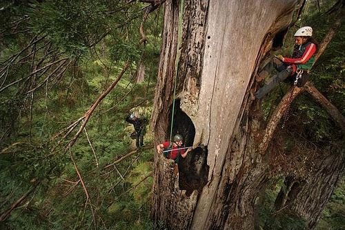 联邦塬溪红杉公园(Prairie Creek Redwoods State Park)内,来自加州洪堡州立大学的科学家斯蒂芬·谢雷特(Steve Sillett,中)正和他的团队在一株三四十层楼高的红杉上测量山火在红杉上造成的“创伤”。山火曾两次降临此地,但依旧没有摧毁这棵参天古木。