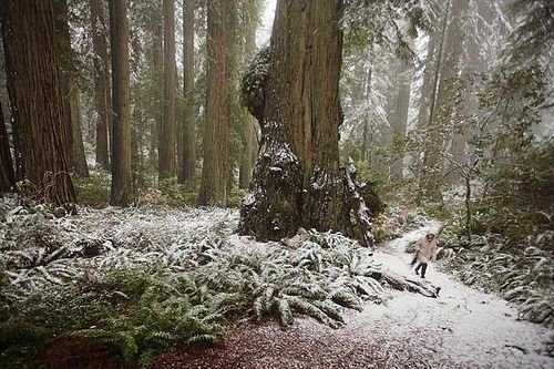 12月,一场罕见的大雪光临德·诺特海岸红杉国家公园。积雪覆盖了林间小路,一名路人正从一棵巨大的红杉旁走过。受冷湿的海洋性气候影响,海岸红杉得以在深入内陆30英里的范围内恣意生长。