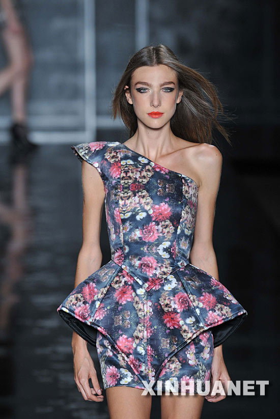 1月10日,在巴西里约热内卢,一名模特在时装周上展示带有中国元素的服装设计。 当日是里约时装周的第三天,巴西本土设计师从中国传统服饰的花案中得到灵感,设计出一系列带有中国元素的服饰,并在本届时装周上展示。 新华社记者 宋为伟 摄