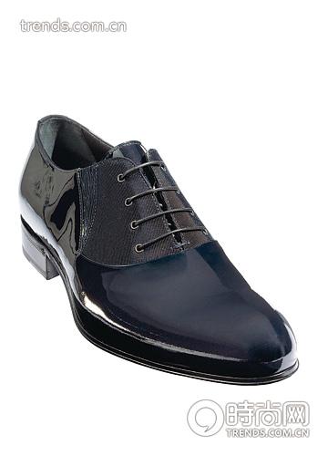 深色漆皮与布饰质感的局部细节设计是这双皮鞋的最大亮点。