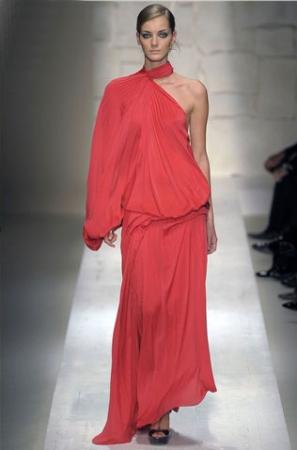 玫红色的亮丽一下子扎入我们的眼睛,柔滑的丝缎和嵌亮丝的面料互相缠绕交错,不同的光泽质感丰富了视觉。再加上斜肩的吊带、80年代风格的Body-con捆绑设计,以及前短后长露出修长双腿的裙摆,都让这款长裙成为本季最佳性感之选。