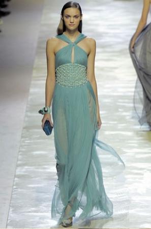 轻舞的薄纱能满足所有对梦幻的向往,胸前的交叉设计和宽阔的钉珠腰饰是两大重点,前者带来令人遐想的性感,后者是体现典雅气质的精致。