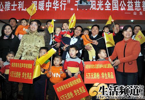 据了解,此次“爱心雅士利 温暖中华行”千万阳光工程全国公益捐赠活动由中国扶贫开发协会、《中国扶贫》杂志社及中华慈善国际互联网救助中心主办,广东雅士利集团股份有限公司承办,全国各省、市、自治区、直辖市公益慈善机构共同参与, 在11月1日在北京人民大会堂正式启动后,11月10日在内蒙古举办了首站捐助发放仪式,今天马不停蹄走进山东,据雅士利集团集团介绍,接下来还将到河南、吉林、安徽等全国范围的30多个地区进行捐助活动。