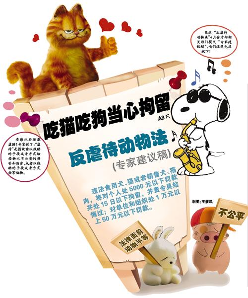据了解,《反虐待动物法(专家建议稿)》分为9章,大致包括反虐待动物的主要制度,野生动物、经济动物、宠物等多类动物的反虐待措施,动物医疗、动物运输、动物屠宰的反虐待措施,法律责任以及附则。其中最引人注目的一条是“违法食用犬、猫或者销售犬、猫肉,将对个人处5000元以下罚款并处15日以下拘留,并责令具结悔过;对单位和组织处1万元以上50万元以下罚款。”