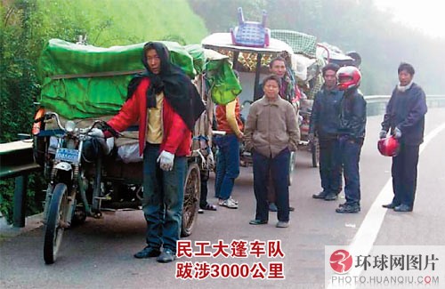 2008年12月,渝黔高速路东溪收费站迎来一个特殊自驾车队——车队由四辆货三轮摩托车组成,驾乘人员无不蓬头垢面。每辆车上,横七竖八摆放着板凳、被褥、热水瓶、塑料桶等家什。这是一群在广东汕头打工的四川农民工,受金融危机影响,他们丢了工作,不得不驾驶三轮车,行程数千里,回家。“我们的大部队还在后面,出发时,车队共有14辆三轮车。”