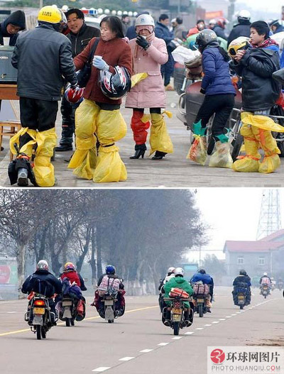 如果你有一双俯视尘寰的眼睛,一定会为这样的情景动情:每天都有数以千计的民工兄弟骑着摩托车,在寒风冷雨中,不辞辛劳、不远万里地奔赴一个灯光温暖,叫做"家"的地方,为了一个同样目标——回家过年。在46省道龙游段,几辆摩托车从金华方向驶来,车后行李架上绑着一条被子和两三个行李包,车上人员戴着全封闭头盔,身上包得严严实实。据了解,这些大都是在温州、义乌等地打工的江西、安徽民工,他们携家带口骑摩托车回家过年。