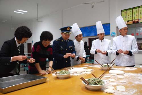 慰问团员与战士一起包饺子