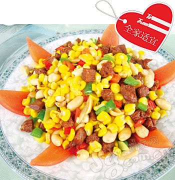 3. 锅内给少许油,下姜片炒香,入粟米粒、青红椒丁微炒,将盐、生粉、生抽、白糖制成味汁入锅,同原材料略炒,下果仁和素肉粒炒,起锅装盘,西红柿切成莲花瓣装饰即可。