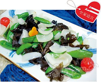 2. 先炒甜豆、木耳,放盐、少量糖。