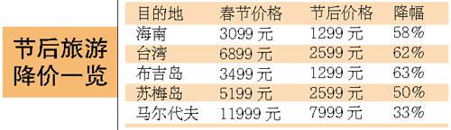 一路飙涨的旅游价格终于从今天开始大幅跳水。来自各大旅行社的报价显示,与春节黄金周相比,即日起节后整体旅游价格下降三至四成,最高降幅超过六成。其中降幅最大的是春节期间涨至万余元的三亚酒店房价,节后跳水将近八成。