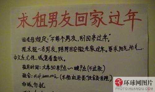 情、婚姻这种事情,不是自己想怎样就能怎样的。于是,为了照顾父母的心情,也为了难得的回家团聚开开心心,“租个朋友回家过年”悄然流行开来。最近,一条名为《女生张榜租男友回家过年1天1万》的帖子在网上引起了一片哗然。据悉,张榜人是北京大学的一名女学生,她在北大男宿舍门口张榜:租男友回家过年1天1万。其中写明了她租男友的原因是她母亲规定:不带个男友,别回来过年。榜上还列明了一系列的要求,以及租用时间和租金。