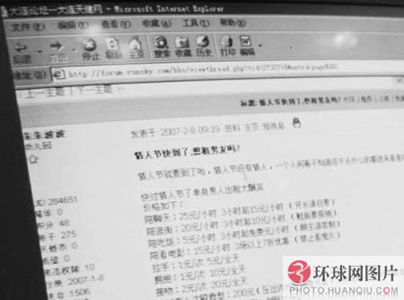 “情人节快到了,想租男友吗?”2007年2月,一则出租男朋友的帖子在大连一网站的论坛中格外显眼。更为特别的是,帖子中对各种服务明码标价,比如“陪聊天:25元/小时 3小时起15元/小时”、“接吻:2元/次 20元/全天”等,甚至还有“陪过夜”的服务项目。不仅明码标价,帖子最后,发帖人还发出了号召:“愿意出租自己的男人和想租男人的女人都来报个名来!”,并表示,无论租出租进,有意者都可以通过短信联系。