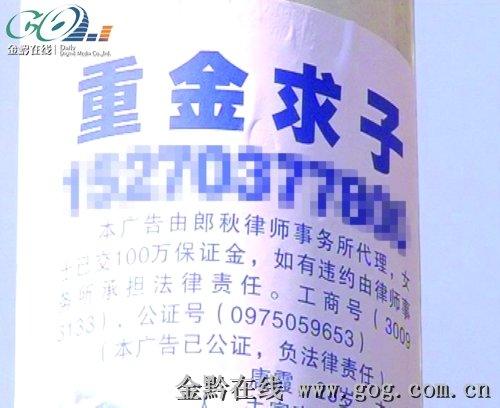 这几天,在都匀市区主要街道的电杆上和小区广告栏上,都有一张附带相片的“重金求子”的广告。公安人员在抓获张贴者进行审讯后,提醒广大市民这种广告除了电话号码是真的外,其他的一切都是假的,谨防上当。