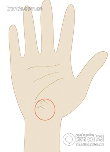 ●如果此区中间有岛纹、“米”字纹、三角样纹,说明易患妇科疾病,应该定期做B超检查。