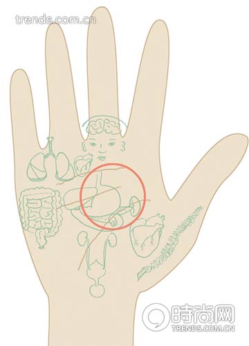 位置在手掌中央、智慧线下方,这个区域可以观察胃的功能,从这里能看到营养、代谢的状况。