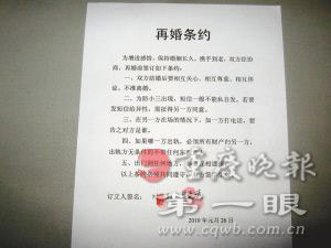 家住大渡口水丽苑的王文强称,3月1日,他约曾晓彬出来打牌,但曾告诉他,必须经妻子同意才行。王文强了解到,原来曾晓彬两口子写了再婚条约,曾晓彬外出打牌,必须向妻子通报。“以后喊他出来打牌,恐怕得提前几天预约哟。”