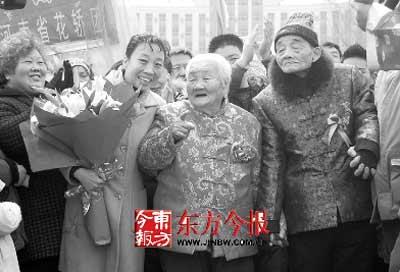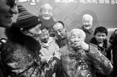 现场一些老人看到一对年龄如此大的老人结婚,纷纷露出羡慕神色。他们忘记了年龄,也一个劲儿地往前挤,想一睹为快。“他们没结婚,在一起生活了80年,真是了不起啊!”一名戴着小棉帽的老太太竖起大拇指说。