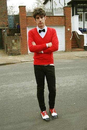 着装智慧:①红色拼接牛津鞋与红色针织衫的呼应。②黑色小领结的运用。