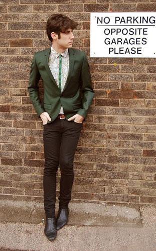 1.复古碎花衬衫 Vintage Shop 2.墨绿西服外套 topman 3.绿色丝带 DIY 4.黑色瘦腿裤子 topman