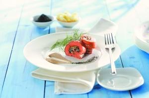 1.将鲜三文鱼柳去皮,摘出鱼刺和切去多余脂肪,用刀从鱼柳中间向左右两边片开,但不要完全切断,然后在三文鱼上盖上保鲜膜,用拍肉板轻轻地将鱼肉拍成0.5cm薄片,再撒上柠檬皮碎、鲜莳萝碎、盐(3g)和白胡椒粉(3g)调味。