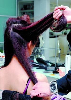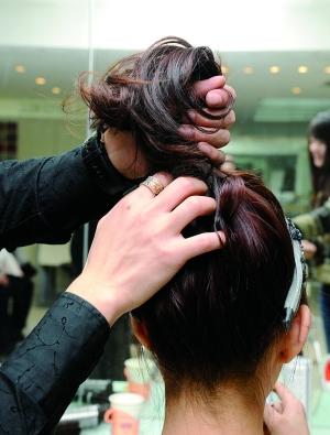 1 分区烫卷。从头顶向耳朵方向,把头发分成前后两部分,再把后半部分头发分成上下两部分,固定上半部分头发;把下半部分头发分成四部分,用预热到130℃的电卷棒夹住发尾把发梢向内卷;再把上半部分头发分成左右两部分,用电卷棒把头发向内卷,把头发打理得柔顺、蓬松。