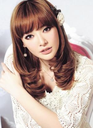 2.标准款梨花头的样子,低层次中长度的底线发长,标准的梨花头式刘海,标准的颜色。