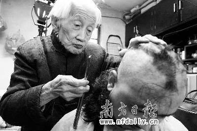 昨日是农历二月二“龙抬头”,是剃头的良辰吉日。家住北京景山脚下、现年97岁的老理发师靖奎老先生顾客盈门。