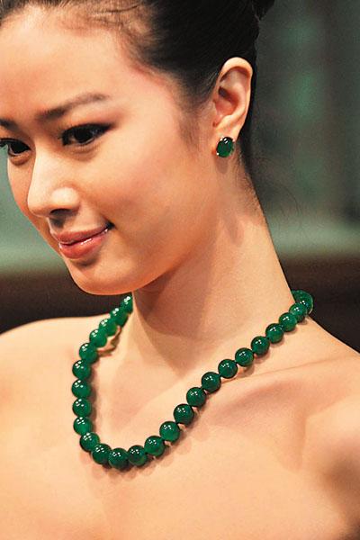 模特儿颈上的翡翠玉珠颈链镶嵌卡地亚铂金钻石扣饰,估价高达3,800万至5,000万港元。图片来源:香港文汇报