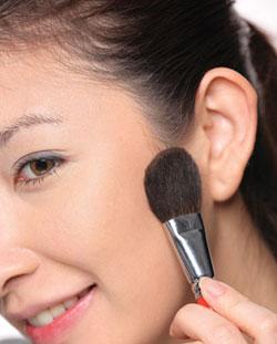 腮红方面选用橘色腮红,少量使用,制造出健康感的肌肤状态。制造小脸效果在裸妆里同样不能省略,只是在颜色选择上,尽可能选择自然的色调,千万不要因为贪图更大的缩脸效果,就选择深色的修容粉。将修容粉沿着发际到下颌的位置轻轻扫上去,是由外向内,靠近耳根的颜色最深。注意腮红和阴影的衔接要自然过渡。