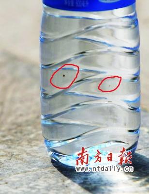 上周四,王先生两名同事前来串门,饮用这箱益力矿泉水,发现瓶里漂着一片小指甲大小的黑色杂质。