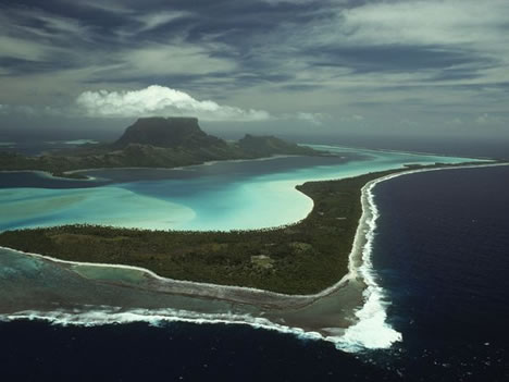 波拉波拉珊瑚礁位于南太平洋上,是法属玻利尼西亚社会群岛中下风向群岛的一部分。在700万年前,这里曾经是一座死火山,火山下沉后残留下来的遗迹周围形成了一圈珊瑚礁。从空中鸟瞰波拉波拉珊瑚礁,清澈的泻湖呈现出梦幻般的蓝色,泻湖之中生活着数百种热带鱼。波拉波拉珊瑚礁最著名的景点,就是洁白如雪的沙滩和两座高峰,即奥特玛努山和帕西亚山。