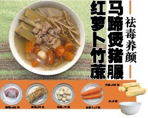 春季二三月是皮肤病和小儿麻疹好发季节,此时最适合饮用红萝卜竹蔗马蹄茅根水,它能祛麻疹病毒,凉血解毒、清热养阴、滋养肌肤。今天加一块猪 一起煲汤,增加甜香之余,还有健脾养胃功效,是男女老少皆宜的靓汤。