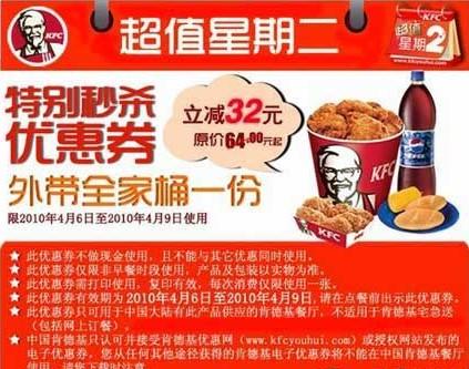 4月6日,投诉肯德基出尔反尔取消优惠活动的帖子遍布网络论坛。据网友反映,6日是肯德基“超值星期二”活动优惠日子,但从网上辛苦“秒杀”回来的半价优惠券,突然被肯德基单方面宣布无效。与此同时,中国肯德基发表声明称,由于部分优惠券是假的,所以取消优惠兑现。(4月7日《广州日报》)