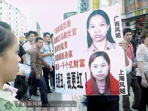 4月11日下午,一男子在南宁市裕丰商厦门前,举出“广西凤姐征婚”的广告牌,声称要为自己的一位亲戚——“广西版凤姐”征婚。“广西凤姐”故作神秘没现身,但其开出的征婚条件却“雷倒”了众多围观市民。
