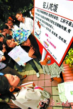 “我是乙肝病毒携带者,我想告诉您:乙肝不是消化道传染病,不会通过共餐等日常生活接触传播,有人不敢与我共餐,甚至包括我的家人。现征人一起吃饭,我请客,您吃饭。”昨日,广州购书中心门前,一名女孩高举着这样一块牌子要征人一起吃饭。女孩的网名叫锄草,是一名留日海归,跟网友成立了“锄草”科普组织,专门进行乙肝科普活动。
