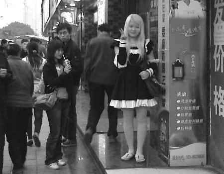 台湾有女仆装的理发店、上海有女仆装的咖啡馆,而在重庆街头,也出现了一位穿黑色女仆装的金发女孩,仿佛来自日本动画片中的人物。《动漫人物?90后穿女仆装逛街》,报网互动4月19日就报道了这样一位17岁的日系“动漫族”潮人。据悉,这位女孩是一位地道的日系“动漫族”,有时候是女巫装,有时则是人型电脑装,不管天气如何,几乎每天她都会按照日本动漫角色的穿着出门……