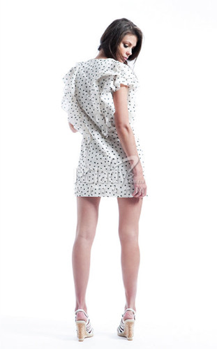 可爱度十足的圆点图案想必是众多MM的最爱,肩部也用荷叶边作装饰,间隔较宽的圆点图案一点也不会有显粗胖的感觉,连身短裙搭上楔跟鞋,有着绝妙的拉长身线的效果!想显瘦的MM一定要试一下这一款装扮!