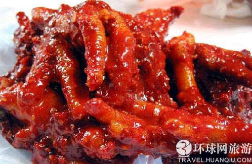 去掉鸡爪的骨头,闷熟剩下的肉。这种菜在一般餐厅里很难吃到,和炒鸡珍一样是路边吃摊的特色。味道又脆又辣。
