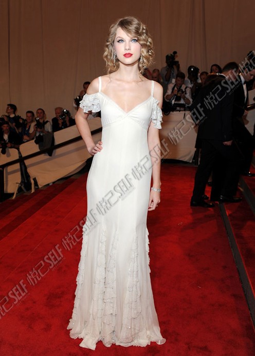 乡村女歌手Taylor Swift (泰勒·史薇芙特),身着Ralph Lauren白色礼服,搭配Fred Leighton珠宝,出席2010时装学院盛典(Met Costume Institue Gala)。