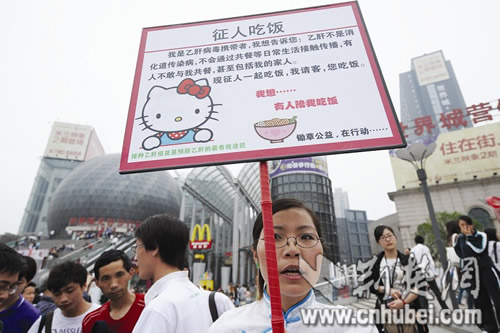 今年3月28日,回国后的锄草在乙肝“战友”们的支持下开始了全国乙肝纪录片拍摄和乙肝科普宣传的旅程,迄今走过11个城市,并在5所城市举牌“征人吃饭”,以这种行为艺术宣传“与乙肝感染者共餐不会被传染”的科普知识。