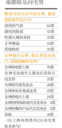 在调查问卷中,我们让宅男对“成为女神的首选条件”这一问题进行投票。身材好样貌佳毫无意外地排在了前列,但真正打动宅男心的却是“拥有清纯的气质”。经纪人小强说,萝卜青菜各有所爱,但清纯的气质比妖冶型更能跟宅男们拉近距离,“看上去就像他的邻家小妹”。但网络游戏投资商T先生则认为,对线上游戏厂商而言,更希望看到天使面孔与魔鬼身材的混合体,“毕竟游戏人物通常都会被设计得很完美,如果只有气质,身材不够好,也不是很吸引人。”