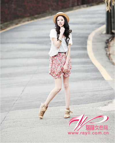 清新自然的小碎花是甜美女孩的必备元素,雪纺材质的花花短裙搭配简单的白色T恤,塑造完美邻家女孩形象。