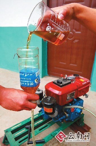 记者来到昆明市西郊的昆明纳能科技开发有限公司。据介绍,生产设备是该公司的最新科研成果,该公司的经理农树仁说,为了将地沟油转化为生物柴油,他就花了两三年的时间,令人兴奋的是,今年3月份,他们投入了试生产,产出了20吨生物柴油。农经理指着一桶生物柴油说,这就是昆明第一桶地沟油转化后变成的生物柴油。该生物柴油微红,有一股精炼油的气味,夹杂着地沟油的臭气。他现场将该油用在了发动机及餐饮燃气灶上,看不出和石化油有什么区别。