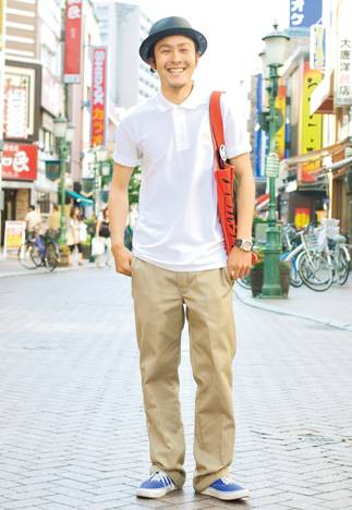 依旧是单色组合。在日本的街头,这种随意休闲的造型组合非常多见。卡其色的裤子,搭配任意一款单色上衣,只需要加个礼帽,或者背个包包,这就完成了一个型男出街的日常标准款。很简单吧?!