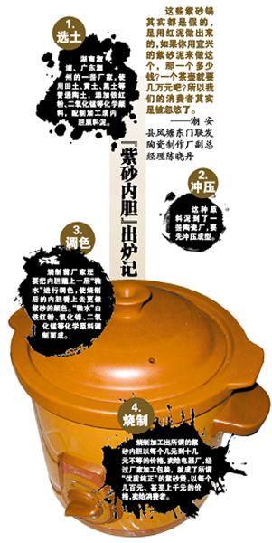 据央视《每周质量报告》报道,近几年,紫砂煲成了炊具市场上的明星产品,销量也是连年上升,消费者选择紫砂煲看中的无外乎就是商家所宣称的健康、营养、养生等等概念。然而记者在调查过程中却发现,这种打着健康招牌的紫砂煲背后却另有玄机。