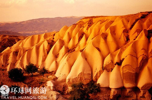 岩石一波一波卷向前方,随阳光的变幻,由白到粉红再变成暗紫色。