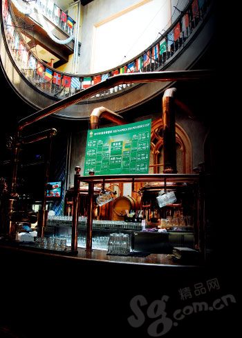 记者来到位于工人体育场东门马路对面的DK1308皇冠自酿啤酒坊,这里以德式骑士装潢为主,门口竖立的骑士铠甲让酒吧分外醒目。工人体育场见证了多年中国足球的经典赛事,这里的足球文化氛围十分浓重,毗邻三里屯酒吧区的DK1308拥有更加适合观看足球比赛的文化底蕴。市场部解经理告诉记者,这里是北京不多的体验传统巴伐利亚自酿啤酒文化的就餐吧。酒吧中庭挑高14米,气势恢宏,硕大的啤酒酿造机(德国顶级品牌酿酒设备Cspary卡斯巴瑞)竖立在中庭,悬挂的比赛赛程清晰可见,便于人们观看球赛。酒吧内悬挂了参加本次世界杯的32国国旗,一进门就能让客人体会到世界杯的气氛。楼上三层的超大投影屏幕能够为球迷看球提供更大的便利。
