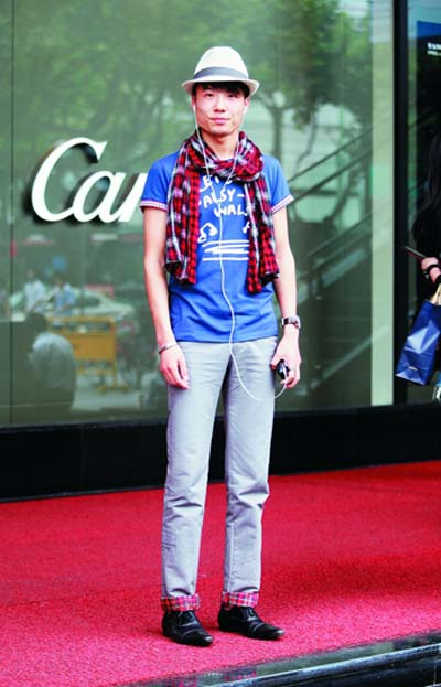 小编:围巾哦!夏天的潮品。而且这种红格子和蓝紫色的T搭配起来很好看呢!仔细看看他的裤脚和袖口,原来又是一对呼应!