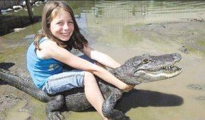 据英美媒体20日报道,大多数9岁女童都更愿意和“芭比娃娃”玩具一起玩耍,然而,美国科罗拉多州莫斯卡市9岁女童萨曼莎·扬平时却更喜欢和一群2.4米长的“自然界杀手”——短吻鳄们一起厮混和玩耍。原来,萨曼莎从小就生活在一个鳄鱼农场中,她从6岁起就开始学会了如何和鳄鱼摔跤,并将它们制服。那些200多公斤重的凶猛鳄鱼在萨曼莎身边就如同是温驯的“宠物”,9岁的萨曼莎不仅常向游客们表演赤手空拳驯服鳄鱼的惊人本领,甚至连美国海军陆战队士兵也慕名而来向她“拜师”学习如何驯服鳄鱼的“致命艺术”!