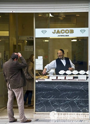 中心火车站前的帕里克大街上是清一色的珠宝首饰店。我仔细数了一下,该有51家。上午10点过后,首饰店陆续开门迎客,店家们忙着将锁在柜子里的珠宝首饰一盒盒摆上橱窗。我走进一家首饰店,店家是个头戴凯吧小圆帽的犹太人。